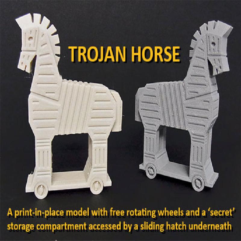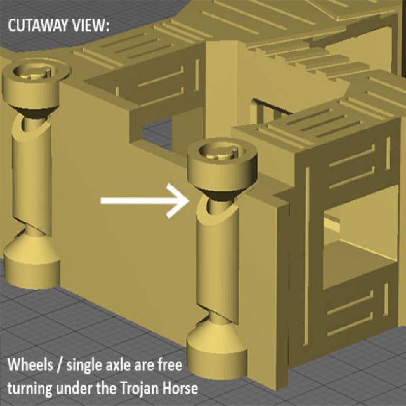The tail / hatch print as two parts (although an .stl including both parts in one print is also included). The horse part is a print-in-place design that, with a good slicing app and accurate machine, will produce a model with free rotating wheels.