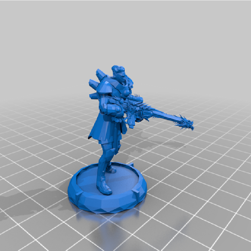 I posed the Battle Mage body and the guns in Blender. Then I took those into Meshmixer with the other models and copied and modified what I wanted until I thought it passed as the real model. Notably, I took Rahn's chest armor, Ravyn's back vents, shoulder armor and skirt thing, and Strakov's head, omitting the goggles. I used the Battle Mage as the base. The gun is kinda weird because I initially just used the Polaris Lance for the gun, but when I printed it the first time, it didn't come out very good, as well as the proportions of the whole model being off. Unfortunately, at that point, I couldn't easily take out the gun, so I ended up just putting the replacement right on top of it, so some parts are still visible. The replacement is a combination of 1000 Voices and Whisper of the Worm, just sitting on top of each other with the triggers lined up. I put it on one of the 30mm bases I made in Inventor. It has little nubs to indicate the facing.