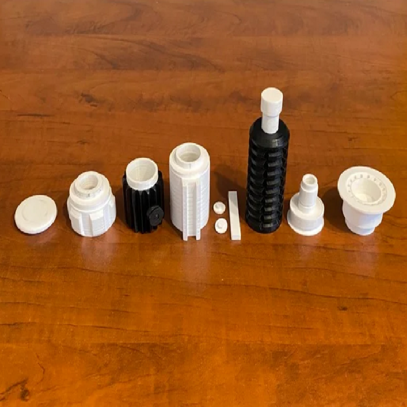 Be sure to paint all the pieces separately before gluing them together to ensure the lines between pieces remain clean. For the pommel, lens house, and emitter I used Spaz Stix Mirror Chrome which gives a wonderful metallic finish, a plain black spray for the gen house and grip, and hand-mixed/brushed acrylics for the choke and lens board. Also, print two 05_lenshouse_button. Assemble pieces in numbered order (1-8).