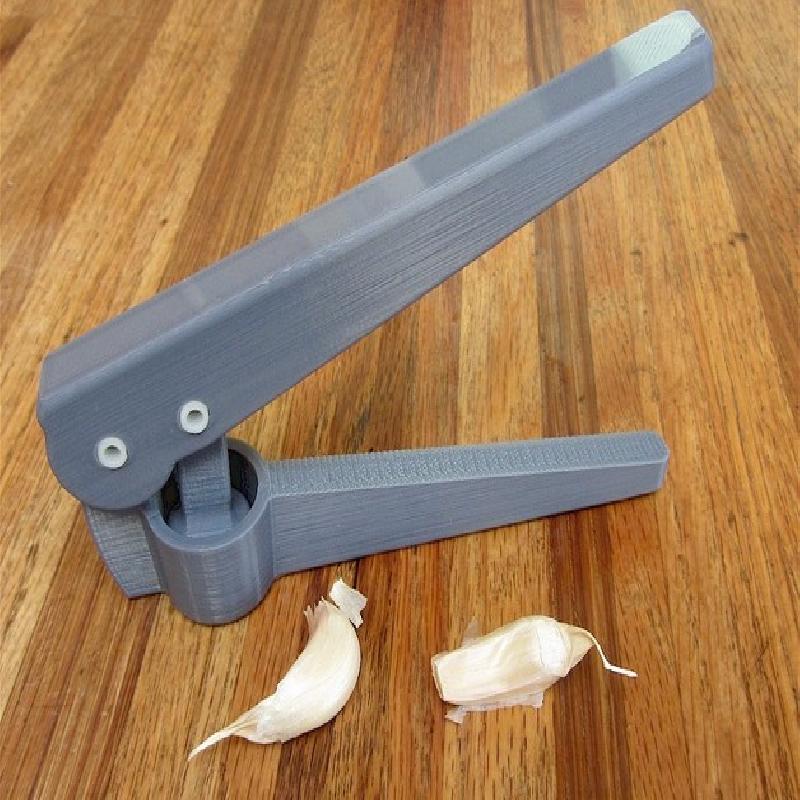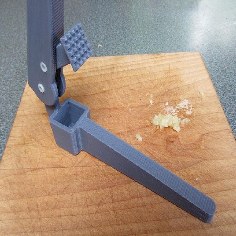 I originally designed this thing as a test for using Proto Pasta's high-temperature carbon fiber filament, but the test print I did in plain old PLA actually works pretty well. PLA is not really food safe because you can't clean it in really hot water, but if you are just pressing garlic with it (and not, say, meat) and the rinse it well afterwords, you probably won't die.