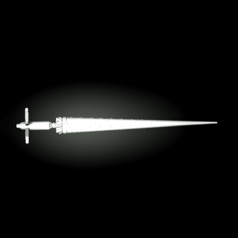 Although you can get a good idea of the shape of spaceship with the description in the book, the author never gave a solid clue about it size. At first I compared with other Bussard ramjet based spacecraft, and I calculated a 2 km length for the Leonora Christina. However this raise a problem. A spacecraft of this size must be craft in orbit, most likely in a low Earth orbit, which maximal height is 2000 km. In the book the main characters see the ship orbiting from Earth as a "small star"; an object of that size, orbiting that close, would be more resoluble than a simple point. The naked eye can resolve at low as 1 minute of arc so I took this info to calculate a max size of 580 m. On the other hand, the tip of the spacecraft would not be as visible as the rest of it; so to approximate an "effective diameter" of the light reflected by the ship I "blured" an image of the model side view until I had an ellipsoidal spot. This blur spot is about 75% the original length, so the new calculated length about 770 m. Anyway this is a max size, but I think it is a good estimate, because the habitable part is 50 m diameter in its wider section, comfortable enough for 50 people.