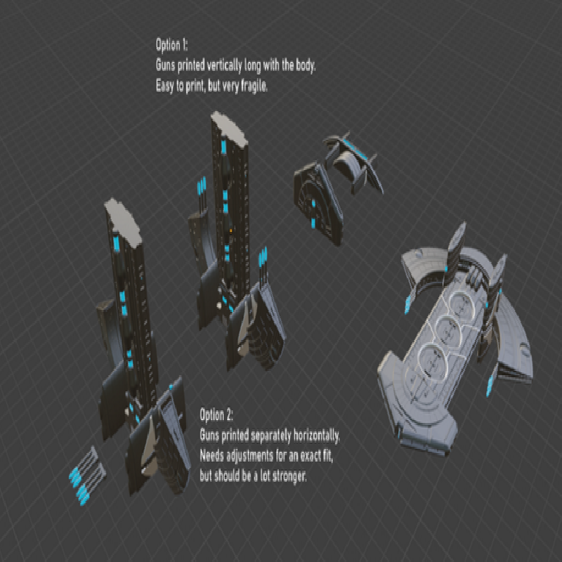 When printing it you have two options: to print it with the guns or to print the guns separately. Because of their small size printing them vertically kind of makes them even more fragile than gaming journalists, so I strongly suggest printing them separately and horizontally on FDM printers.