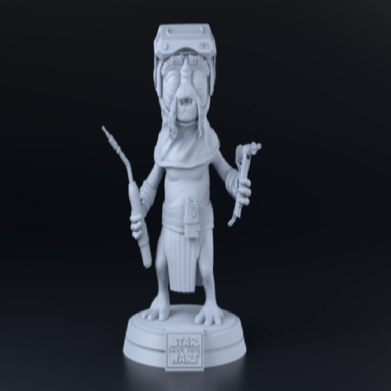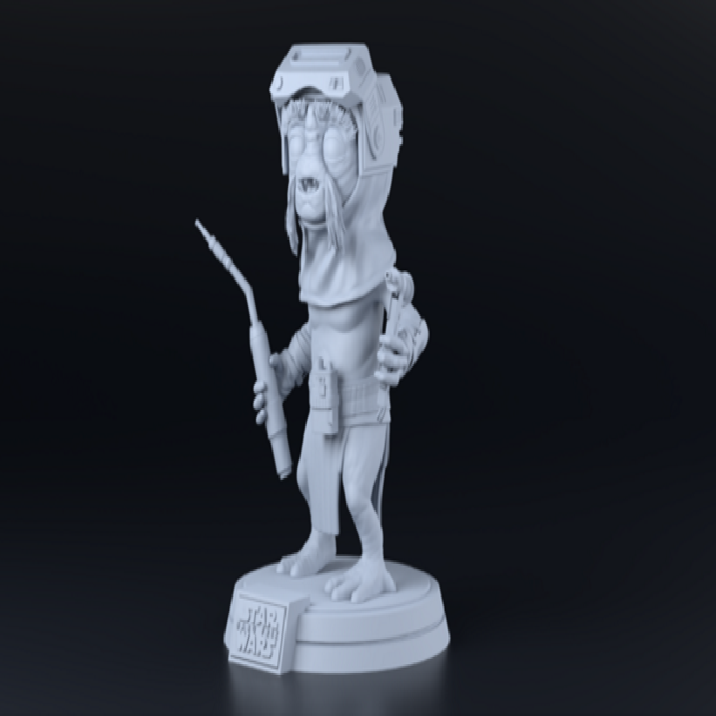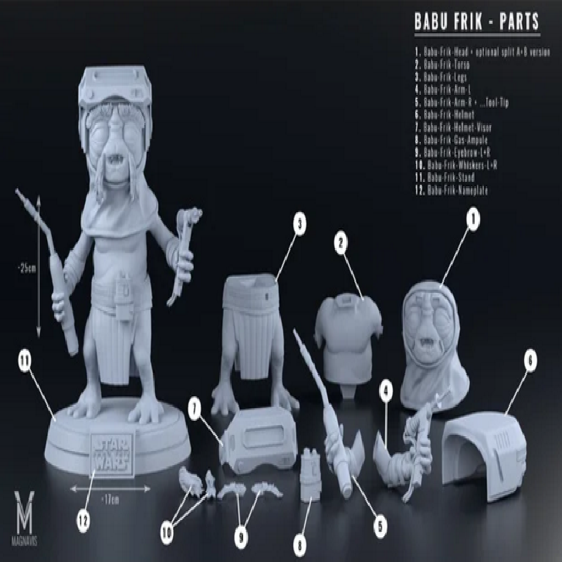 All parts fit on the Elegoo Mars at 100% scale (and similarly sized machines) - with the exception of Babu-Frik-Head, and of course the stand. There is an A+B version (Head split in two) for printing on the Mars.