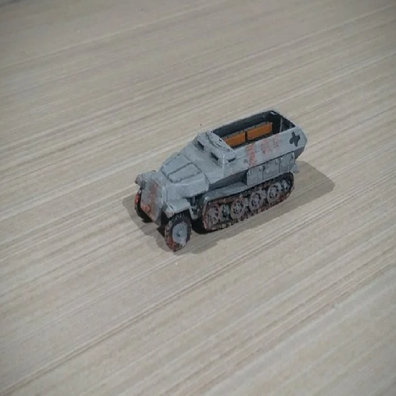 Easy to print Sd.Kfz 251 "Hanomag", 1/100 scale, will want some greebling if scaled up. Some details have been changed for looks/ printability. As far as I can tell this is an early model with the minimum of accessories. I did add the exhaust on both sides, just because it looks nicer to me, in reality it was only on the left side of the vehicle. This had to be cut up quite a bit to get it to print nicely...
