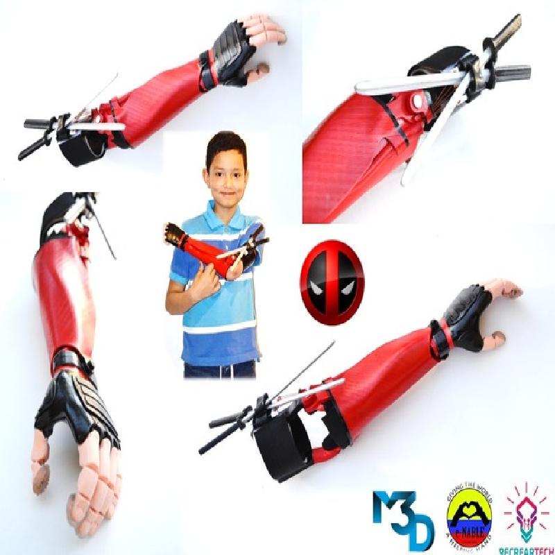 Prótesis Deadpool Flexy Arm II ENABLE es un proyecto diseñado y elaborado por el artista plástico Wilmer A. García P. estudiante de la Universidad Nacional de Colombia y dirigido por el Ingeniero Mecatrónico Cristian Silva estudiante de Doctorado en la Universidad Nacional de Colombia. Modelo a su vez basado en el brazo Flexy de Christian Silva , El Flexy_Hand 2 de Steve Wood (Gyrobot), el brazo RIT (Rochester Institute of Technology) el trabajo del grupo e_NABLE (http://enablingthefuture.org/). Trabajo desarrollado por el equipo e-Nable Colombia y la Fundación Materialización 3D http://materializacion3d.com/ en Bogotá, con la participación y el apoyo de Recreartech http://www.recrear3d.com/ https://www.facebook.com/recrear3d?fref=ts en el proceso de escaneo 3d y la participación de Realiza3D http://www.realiza3d.com.co/ https://www.facebook.com/impresion.realiza3d/?ref=ts&fref=tsen la parte de impresión 3d. Todos estos archivos están cubiertos por la licencia creativa atribución bienes comunes. No comercial, por favor utilice la referencia de nosotros si desea imprimirlo.