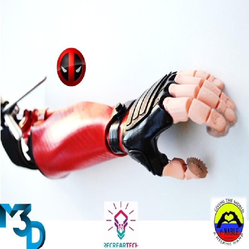 Deadpool Flexy Arm II ENABLE is a project designed and developed by artist Wilmer A. Garcia P. student at the National University of Colombia and directed by Cristian Silva Mechatronic Engineering PhD student at the National University of Colombia. Model in turn based on the Flexy arm of Christian Silva, The Flexy_Hand 2 Steve Wood (Gyrobot), arm RIT (Rochester Institute of Technology) e_NABLE work group (http://enablingthefuture.org/). Work developed by the team e-Nable Colombia and 3D http://materializacion3d.com/ materialization Foundation in Bogotá, with the participation and support of Recreartech http://www.recrear3d.com/ https: //www.facebook .com / recrear3d? fref = ts in the process of 3D scanning and Realiza3D participation http://www.realiza3d.com.co/ https://www.facebook.com/impresion.realiza3d/?ref=ts&fref= Tsen part of . All these files are covered by the common creative license attribution goods. Non-commercial, please use the reference to us if you want to print.