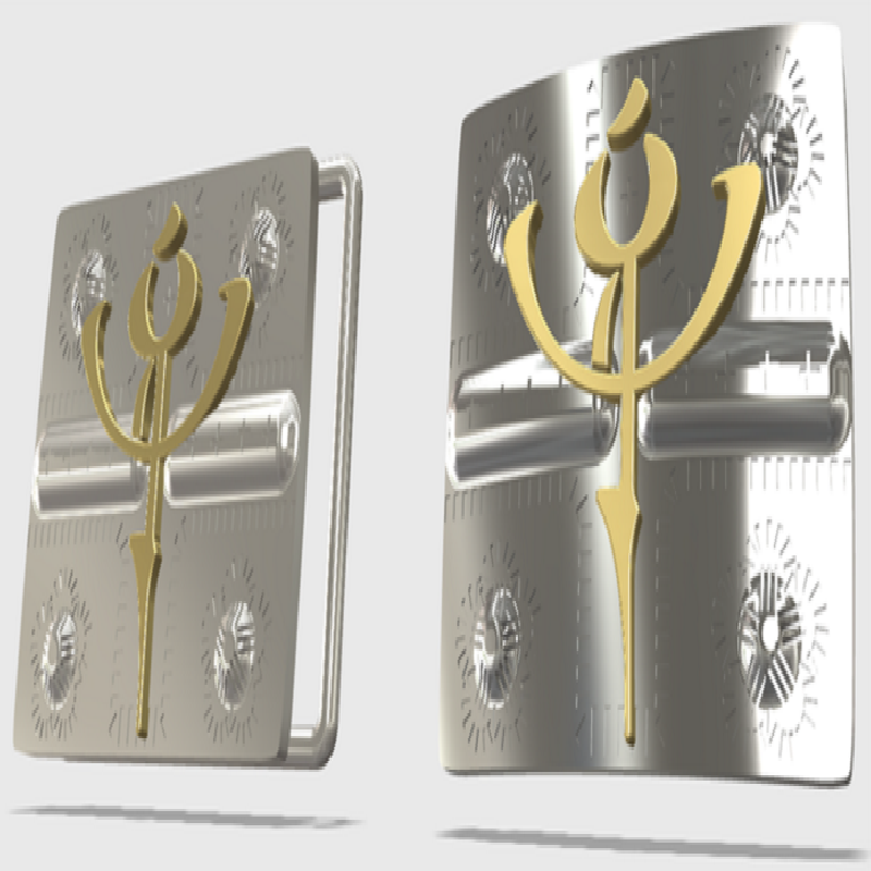 Finishing and painting: the buckle is made of a polished metal with silver/iron colours. The surface can also be made with a hammered metal texture. The central symbol should be golden/copper with traces of use showing the gunmetal underneath.