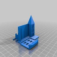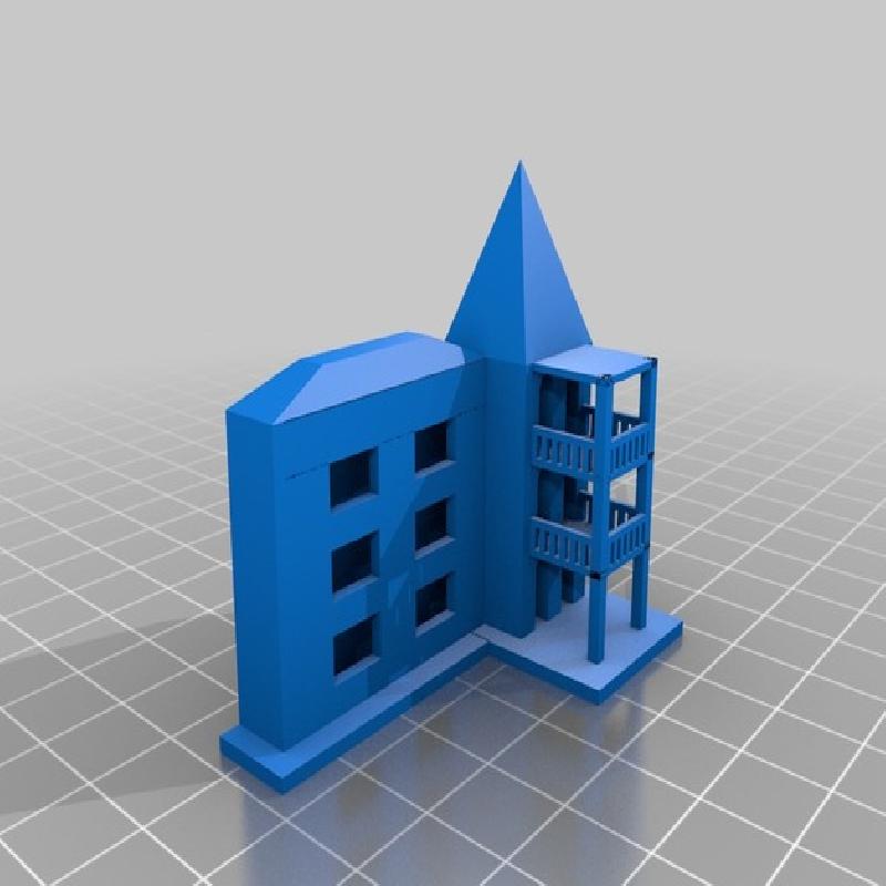 Entrance to a school, three stories, with arched doors and balconies. Inspired by Franej International School in Benin, Nigeria.