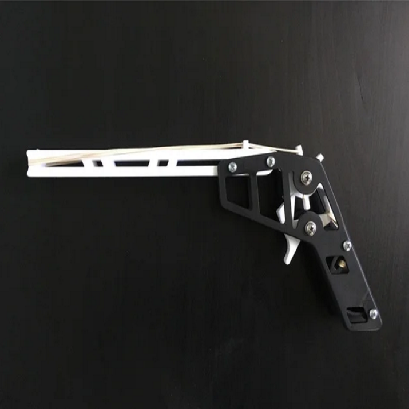 Hello. This is a remix of Gavilan's excellent design. I made the gun quite a bit larger for adults, fixed the trigger, so it releases rubberbands flawlessly (Gavilan's design would catch), added a pocket in the grip for extra rubberbands, extended the barrel to shoot Alliance Rubber 54325 Advantage Rubber Bands Size #32, and made the barrel better with a sight on it. The rubberband connecting the trigger is the same size. I also added hardware to keep the wheel centered and solid, and the trigger easier to install among other fixes. I hope you enjoy!
