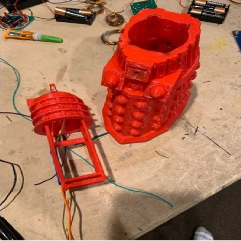 This 3D printable puzzle Dalek has 3 stages to be completed before the head gets unlocked and you can pull it off to find the secret item inside! There are three stages to be completed in any order: A button to be pushed, a knob to be turned, and an RFID tag to be read. One of the LED's on the head of the Dalek will light up after each task is completed. Once all three tasks are completed and therefore all 3 LED's are on, a servo will unlock the head from the body and you can take the head off which is attached to a "cage" that contains the item.