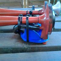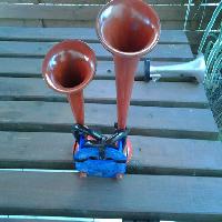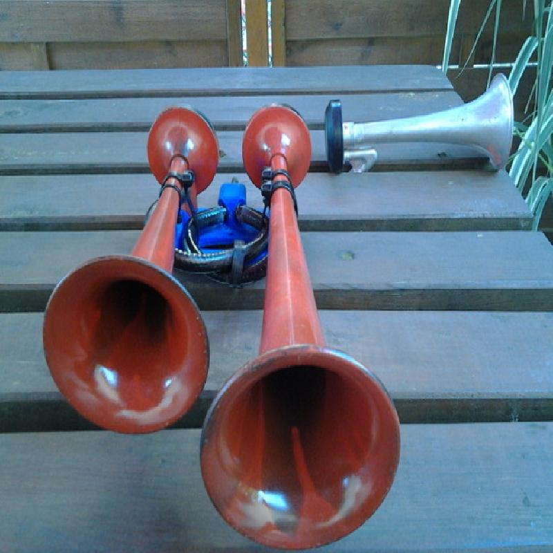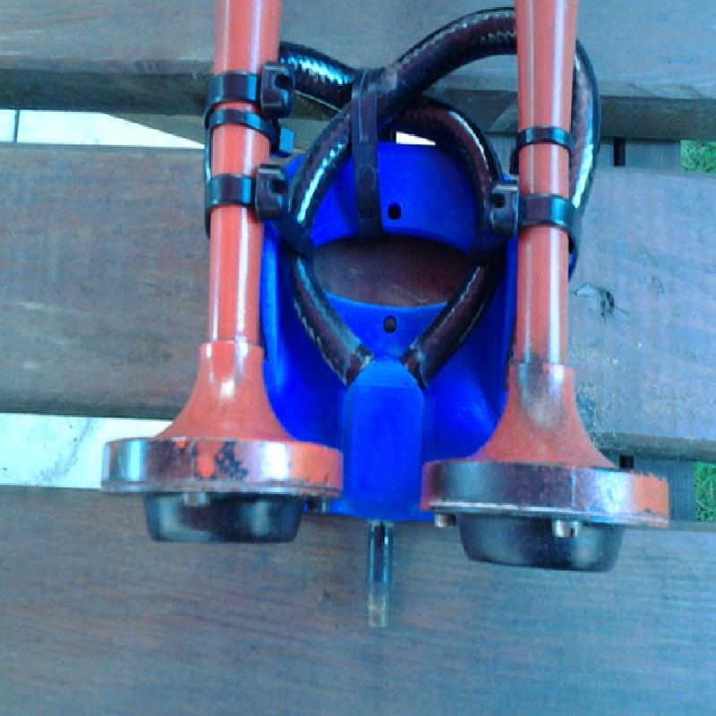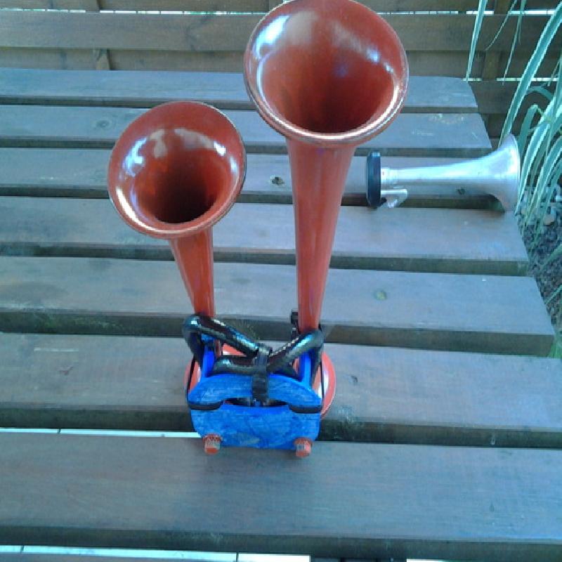 The air alimentation is a recycled bycicle valve fixed with plastic glue and it goe to Two hole 12mm D for usual pneumatic tubes that fit on air horn in general.