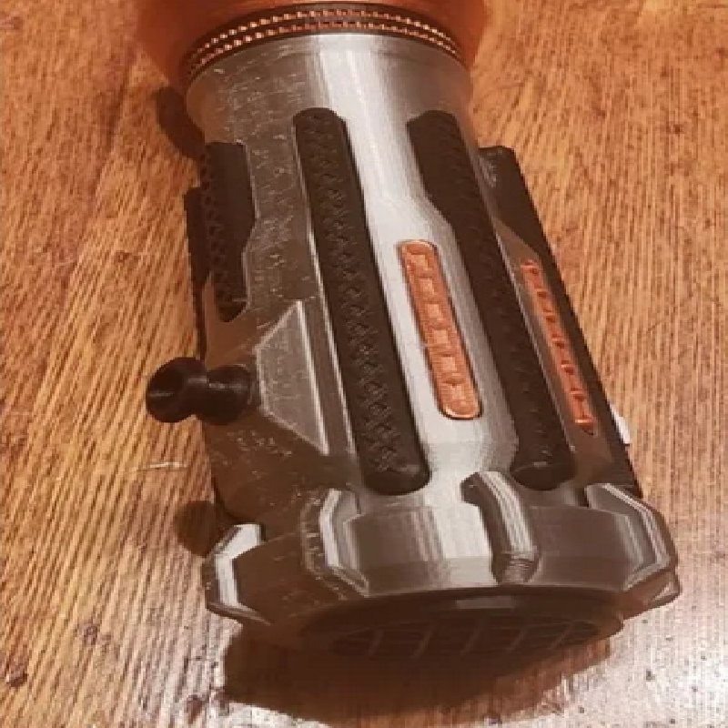 I used the following colors: * silver - emitter, handle lower and upper, pommel * black - head sink screens, emitter heat sink, heat sink backings, emitter bolt heads, grip strips * copper - handle ring, handle washers, lower grip slats, heat sink fins * gold - button housing * translucent green - button * translucent red - other button The metallic filaments were from Mika3D, but the others were various brands.
