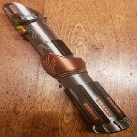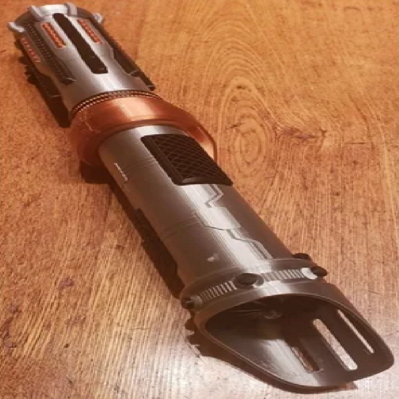 This is a custom lightsaber handle that I designed for a friend. It measures about 13" long. I took design cues from the classic Skywalker lightsaber but added my own twist to it. I tried to make it look like an actual electro-mechanical device with the heat sinks/vents, circuitry on the upper handle, and fan blades at the emitter end.