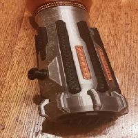 Glue the emitter_heat_sink into the end of the emitter_shroud and glue the 6 emitter_bolts into the holes around emitter_shroud. Glue the shroud onto the top end of handle_upper (the oval hole for the button is toward the top). The tall part of the shroud should be in line with the oval button hole.