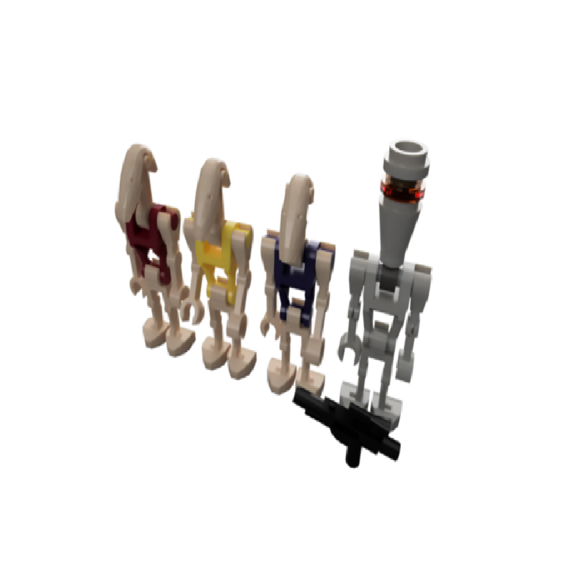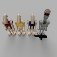 All droids shown have the "body" piece. Most have the "head" piece. The one on the right is composed of all assassin droid parts, b1 legs, body, shoulder 2x, hand straight, and hand 90. The second from the right is composed of head, body, straight 90, bent straight, and b1 legs.