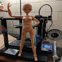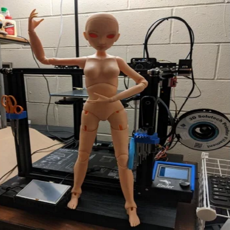 I printed it using 3D Solutech PLA in "Skin" and sanded all outside surfaces starting with 120 grit and going progressively finer until I got to 1000 grit. I strung her legs with 1/8" elastic cord, and her arms with 3mm elastic cord. Her Joints are sueded with hot glue on the socket portion which is what allows her to hold her position. There is a one piece of her hip and thigh that provides better stability, but less flexibility, on the Anime Girl Listing.