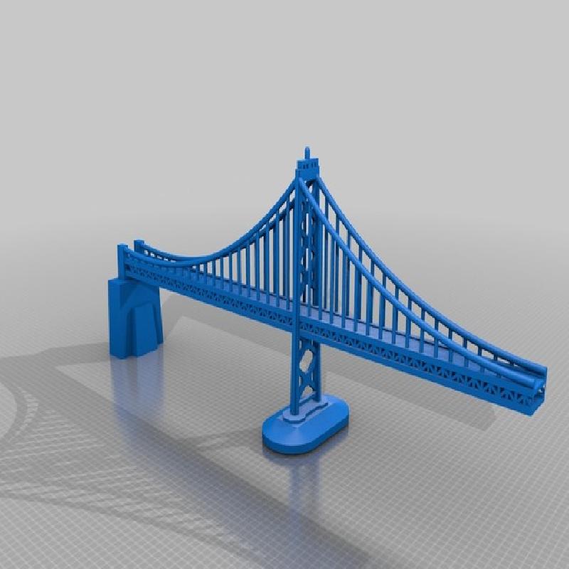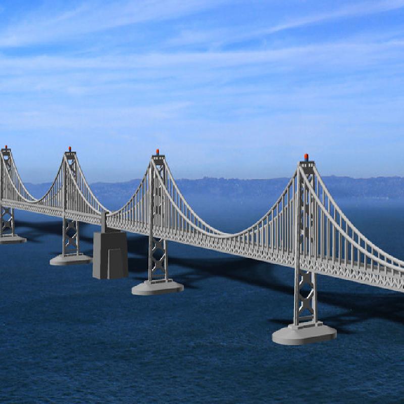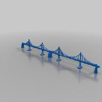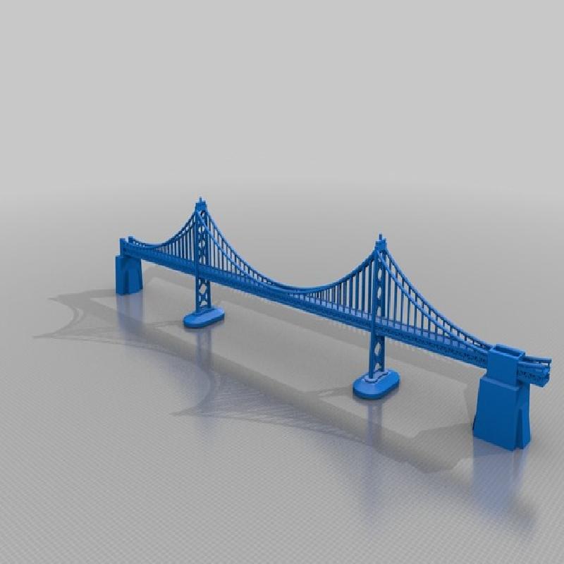 This is a 3D model of the western span of the San Francisco Bay Bridge I designed in OpenSCAD to be 3D printed. All of the smaller features such as the cabling and cross-beam supports have been made so as to be substantial enough to be picked up when sliced for printing (My early efforts had the smaller details simply disappear when sliced).