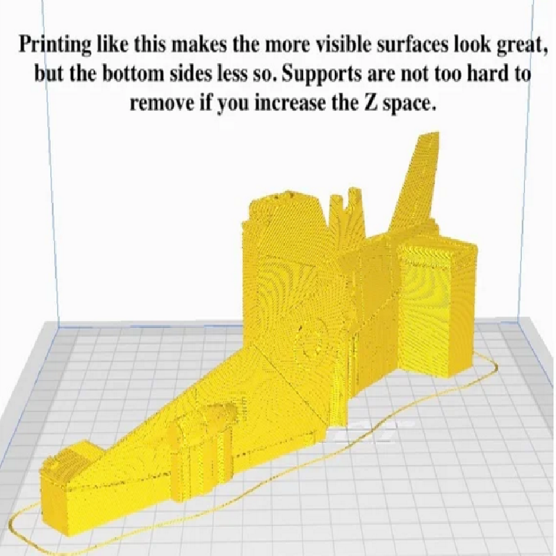 A couple pieces require that you rotate them in your slicer. The Cockpit and the Canopy. Use the third rotate button in Cura to auto rotate to the bottom side and drop it to the plate (see included Cura screen shot).