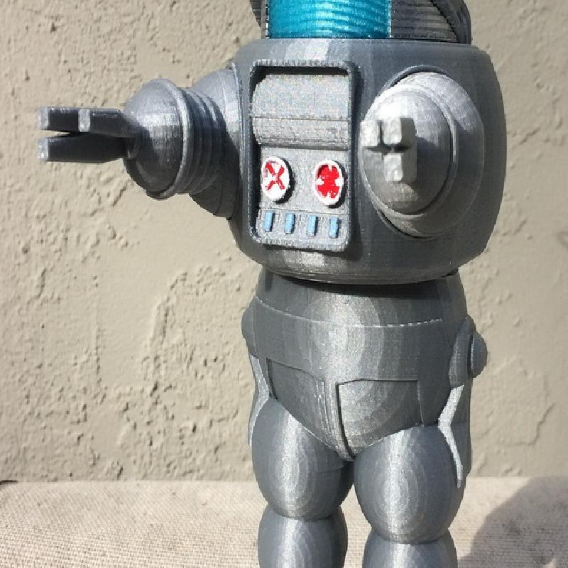 The arms can be pressed into the sockets so that you can change the pose, so I don't recommend gluing the arms. I used a translucent blue PLA for the "voice light" and clear PLA for the dome. The rest of the model was done in silver metallic PLA. The actual robot is a darker metallic color, so you may want to consider that if you build it.