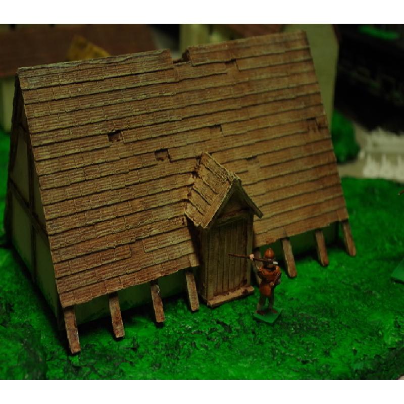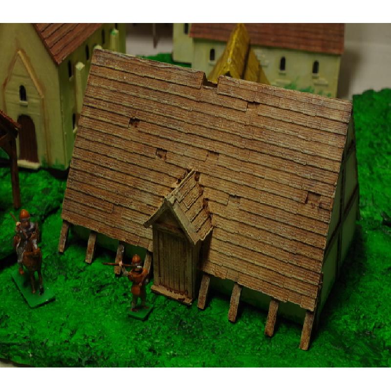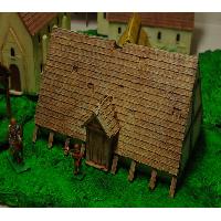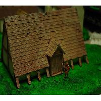 Where better to hang up the sword for a day or two, pull up a flagon of mead or ten, and celebrate Yule, the winter solstice, Modraniht or any other end-of-year pagan festivity, than the village long house, and at the Thegn's expense? This building represents a traditional Longhouse of the Anglo-Saxon era at the time of the Viking invasions / the reign of Alfred the Great. It is in 28mm scale and designed for the wargaming table, but is of wider interest to those interested in the Dark Ages period. It will also be suitable for a viking building et al.