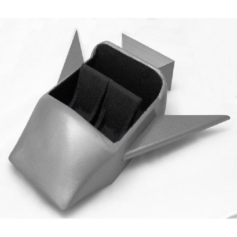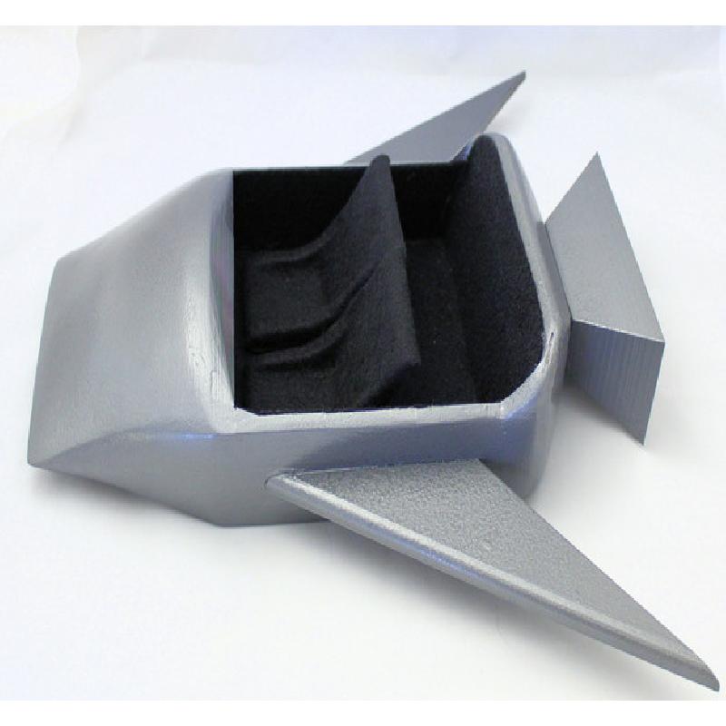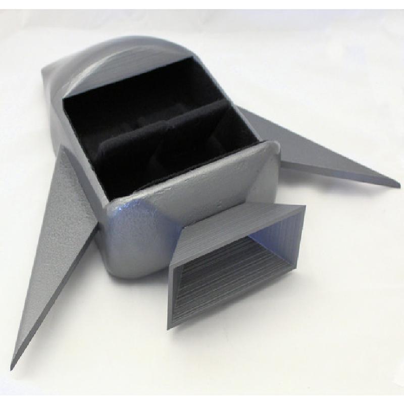 Unless you print this very small, you will likely have to print out the nine main body parts, the wings, the thruster, and the seats and glue them all together. I went the extra mile and slathered the thing with Bondo, sanded, repeated many times, primed, and painted.