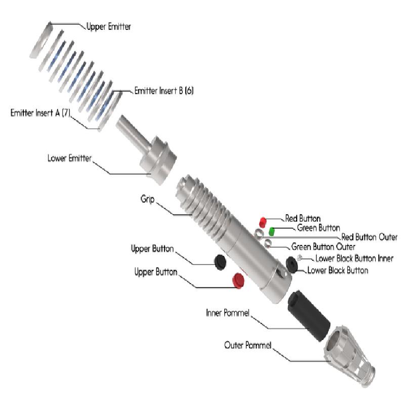 Be sure to print 2 Upper Buttons, 7 Emitter Insert A's and 6 Emitter Insert B's. All of the STLs are in the orientation I printed them. Personally, I printed the Outer Pommel with supports generated in Cura.