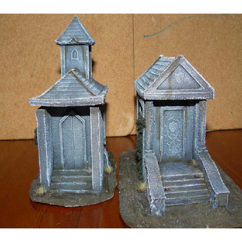 2 Mausoleums suitable for 28mm gaming. Made up of a roof and bottom structure. They are hollow so you can place miniatures inside if you wish. No detail is done on the inside of the mausoleums. This may happen in the future (probably not).