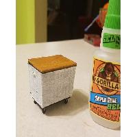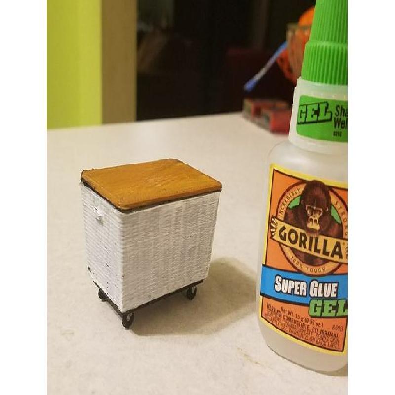 A 1/2" scale of a Theatrical soft goods 20 bushel hamper. Prints with lid attached and then I heated hinges with a lighter then bent into position. Casters glue to bottom.