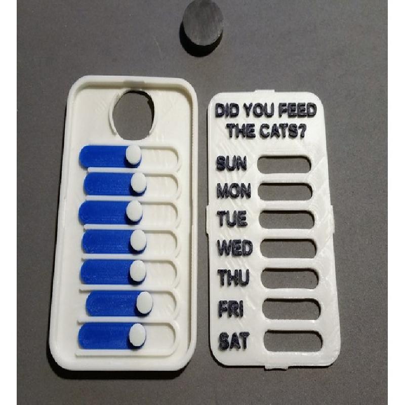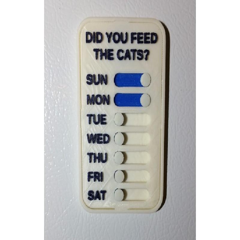 Every morning our cats try to trick us into feeding them more than once. So I designed this simple slider fridge magnet. Now we can mark down if they have been fed each morning and avoid over feeding them.