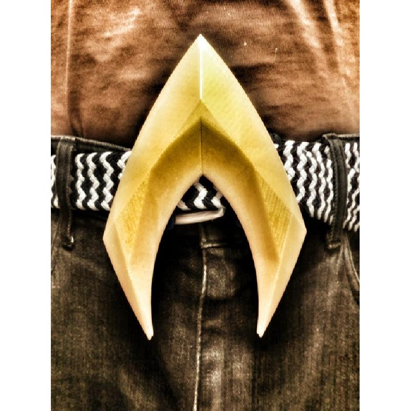 Model based off logo for the new Aquaman movie. Prints in two pieces, which I recommend hot-gluing together. Because of the very sharp, very inconveniently positioned points, this is not a "sitting-down" kind of belt buckle, so I've designed it to be easy to slide off when you're tired of standing.