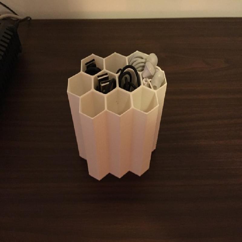 My desktop is always a mess, full of cables everywhere. I created this little cable holder hive. It is meant to be used with small cables, but you can always scale it. Enjoy.