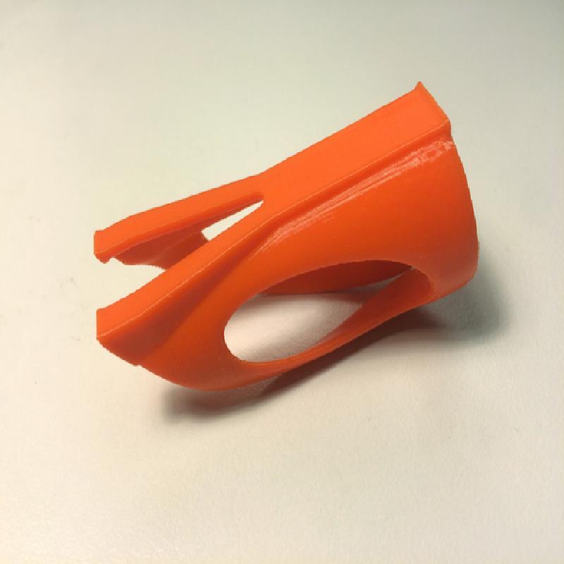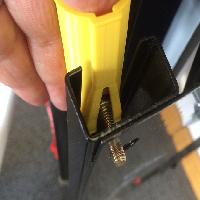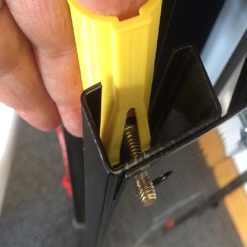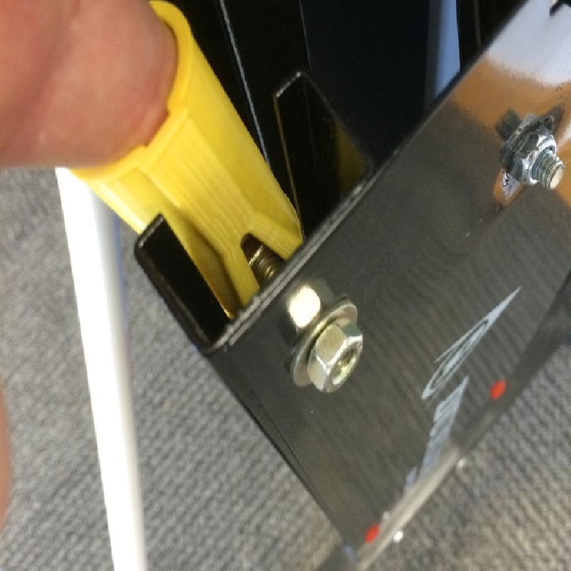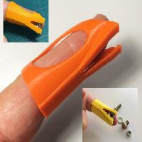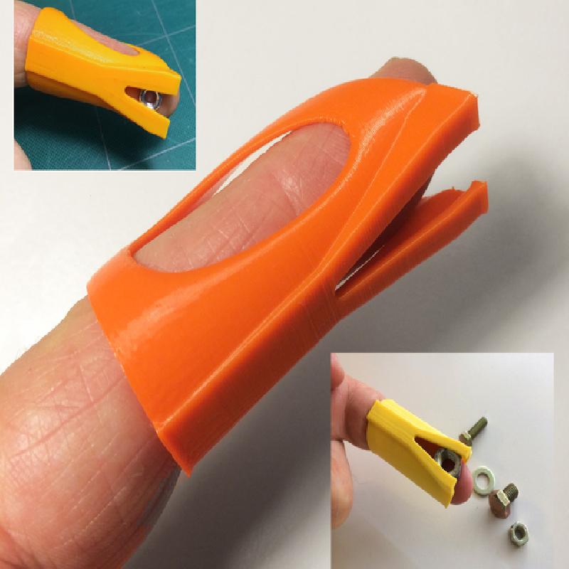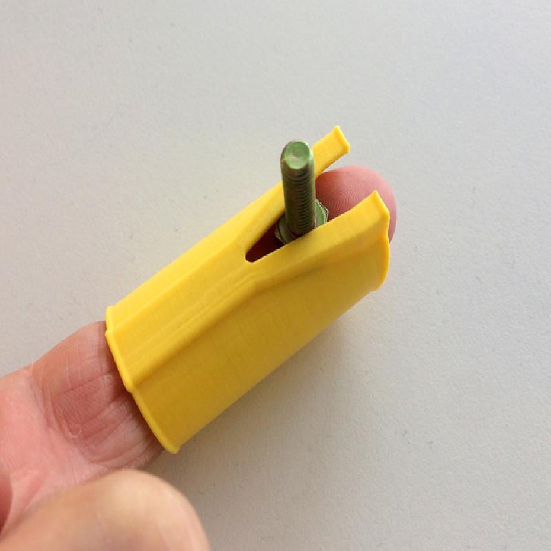 There is a gap all down the back side, thereby allowing one size to fit a wide range of fingers. Slip a nut or bolt into the wrench as shown in the two images. Finger pressure keeps the nut or bolt in place. The tapered slot inside the wrench prevents the nut or bolt from turning.