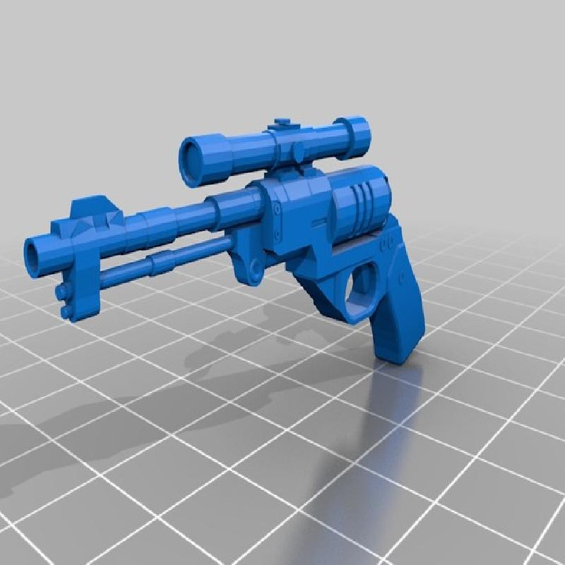 The DE-10 blaster pistol was a model of blaster pistol that saw use in the galaxy during the Galactic Civil War. Its heaviest users in the period were members of the Death Watch, a Mandalorian splinter group based on the Forest Moon of Endor at the time. When a spacer infiltrated the Death Watch bunker, their main base on the moon, sometime after the Battle of Yavin, the sentient discovered a schematic for the weapon along with specialized barrels used in its construction. The spacer eventually had one of the weapons created for personal use.