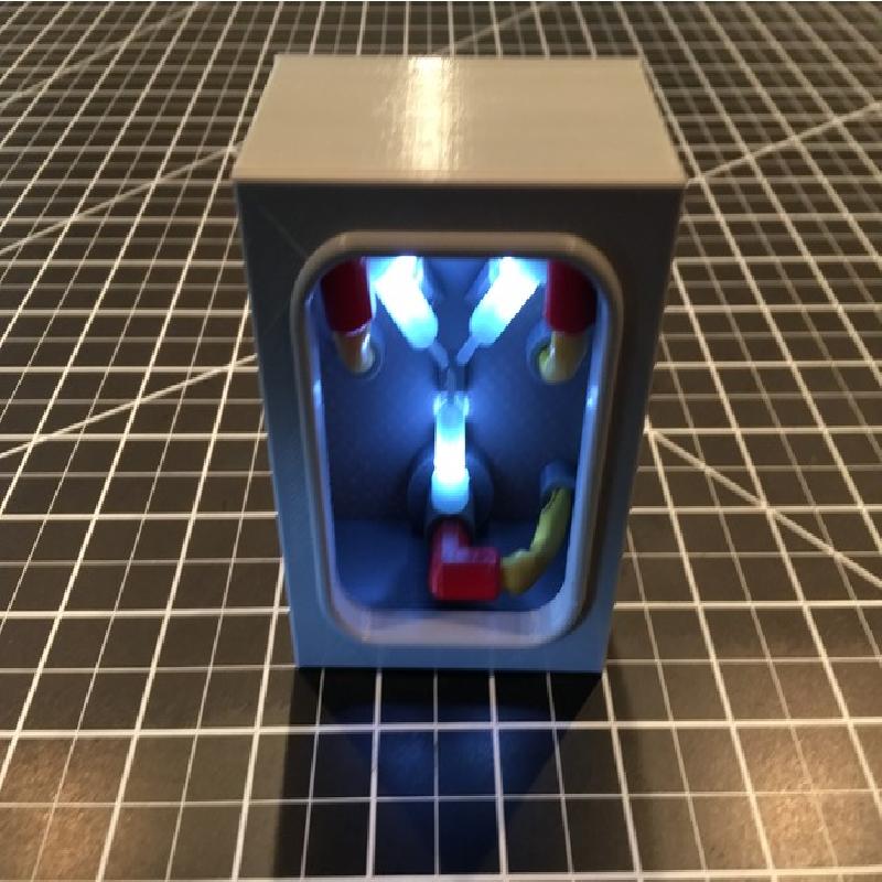 Great Scott! It's a mini version of the flux capacitor from Back to the Future. The parts can be printed in any colors but for movie accuracy the top and bottom should be grey or silver, the hose clamps should be red and the injectors should be clear or glow-in-the-dark. Combine the 3D printed parts with a CR2032 3V battery, three 5mm 3V clear LEDs and three 38 mm long sections of ethernet cord (yellow for movie accuracy).