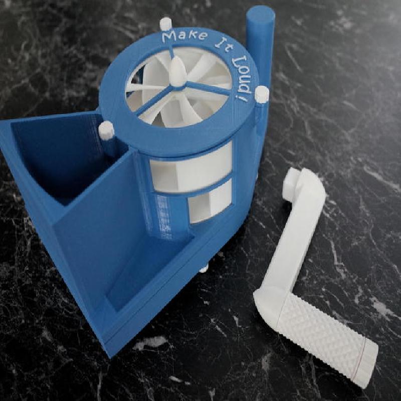 Changed the design of my previous air raid siren. Added a gear box, a hand crank, a turbine and a lot of screws - everything 3D printed...