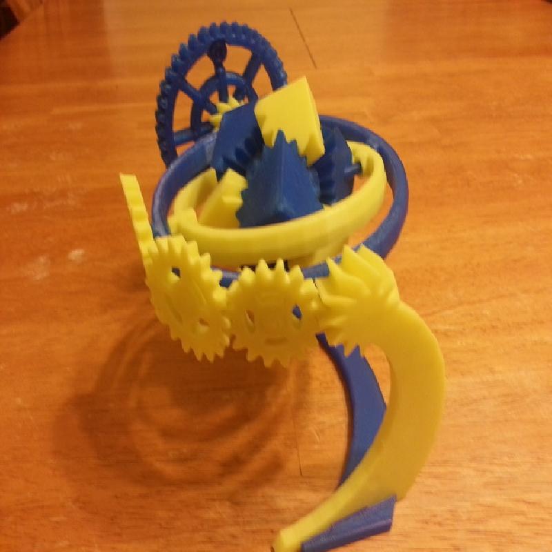 Come one come all and witness the thrills of the Amazing Gyroscopic Cube Gears! With a simple turn of the crank watch as the rings of the gyroscope rotate, the gears turn and the gear cube comes alive. It's simply Mesmerizing! The yellow parts on mine are printed in glow in the dark plastic which makes it even more amazing in the dark (but unfortunately does not show up with my camera).