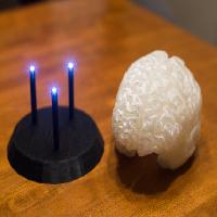 A full-scale replica of a human brain (modeled from an anatomical MRI scan) mounted on a printable stand, featuring LED lights installed within each of the three supports.