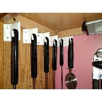 I needed more utensil hooks near the kitchen sink. The only room I had to mount them was on the side of the nearby cabinets. So I made these sideways hooks.
