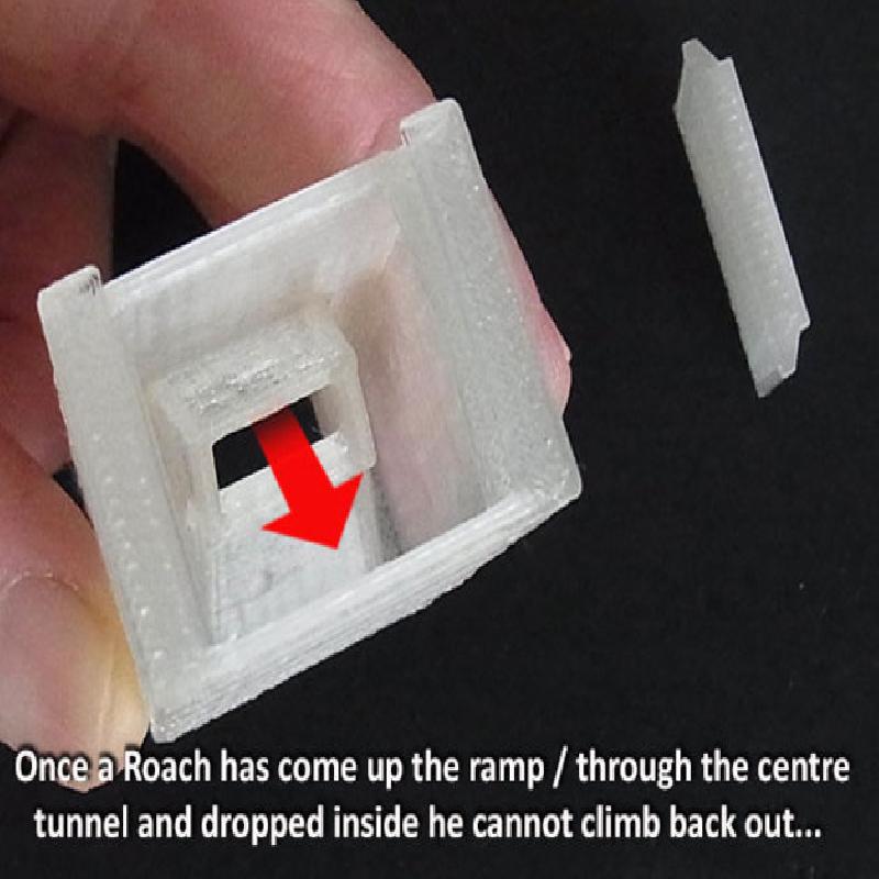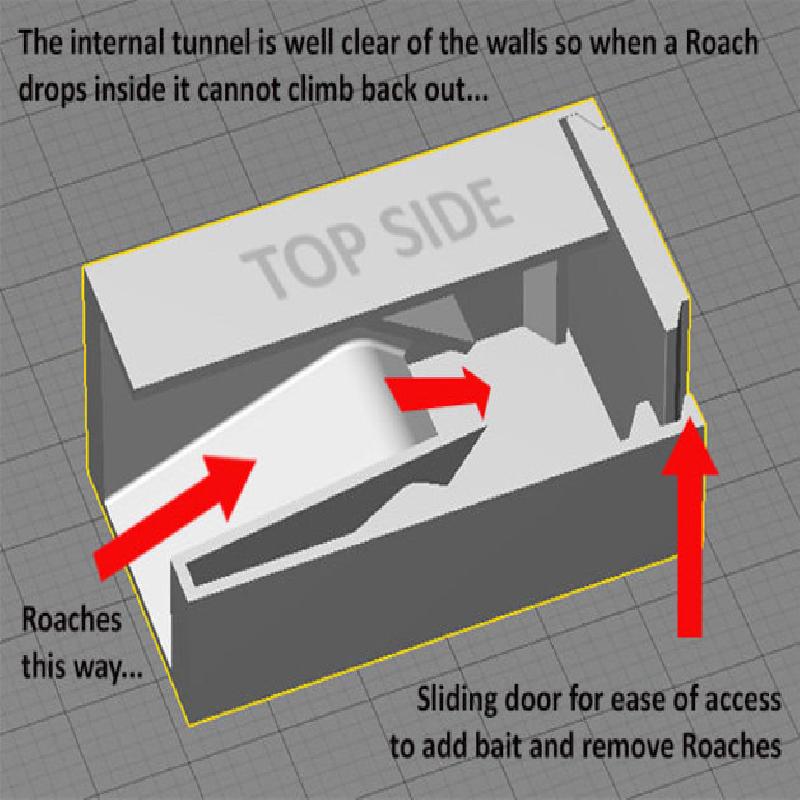 In operation, attracted to the trap by a tempting smell, there is a ramp that is easy for a cockroach to climb. At the end of the ramp there is a drop into the trap... they drop in only to discover there is no way out. The ramp is a tunnel / tube that has no walls / surfaces leading to the entrance that a cockroach can climb to escape. At the other end of the trap is a small sliding door. This is used to insert the bait and... remove trapped Roaches.