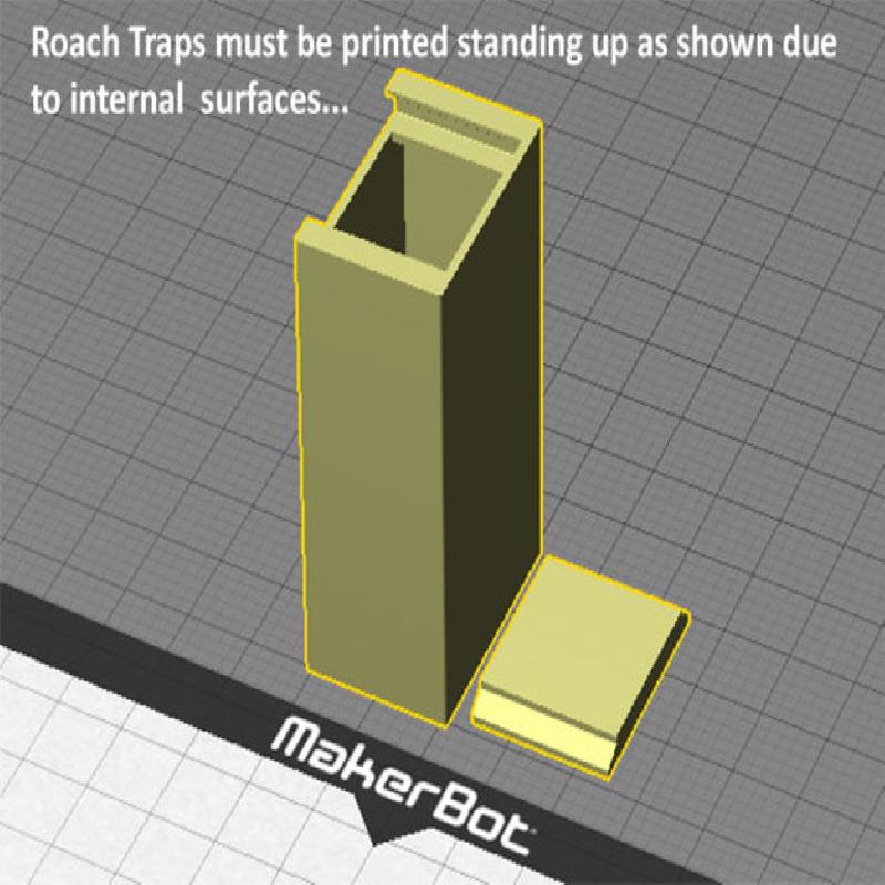 Recommend 2 shells and 50% infill to make the 'Roach Trap' strong as it has thin walls. Although not essential, using translucent filament lets you see in side adequately to see if you've caught a Roach. Raft is recommended to ensure a good build from a solid base. This is due to the thin walls which do not give it a big contact area with the build plate (it builds up on it's end due to the internal shaping).