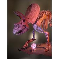 Triceratops is a genus of herbivorous ceratopsid dinosaur that first appeared during the late Maastrichtian stage of the late Cretaceous period, about 68 million years ago (mya) in what is now North America. It is one of the last known non-avian dinosaur genera, and became extinct in the Cretaceous–Paleogene extinction event 66 million years ago. It is one of the few ceratopsians that does not have windows in the neck frill, at the back of ther skull, to make it lighter. The length of the horns and the shape of the frill vary so much from one specimen to another that some skulls have been wrongly attributed to other species.