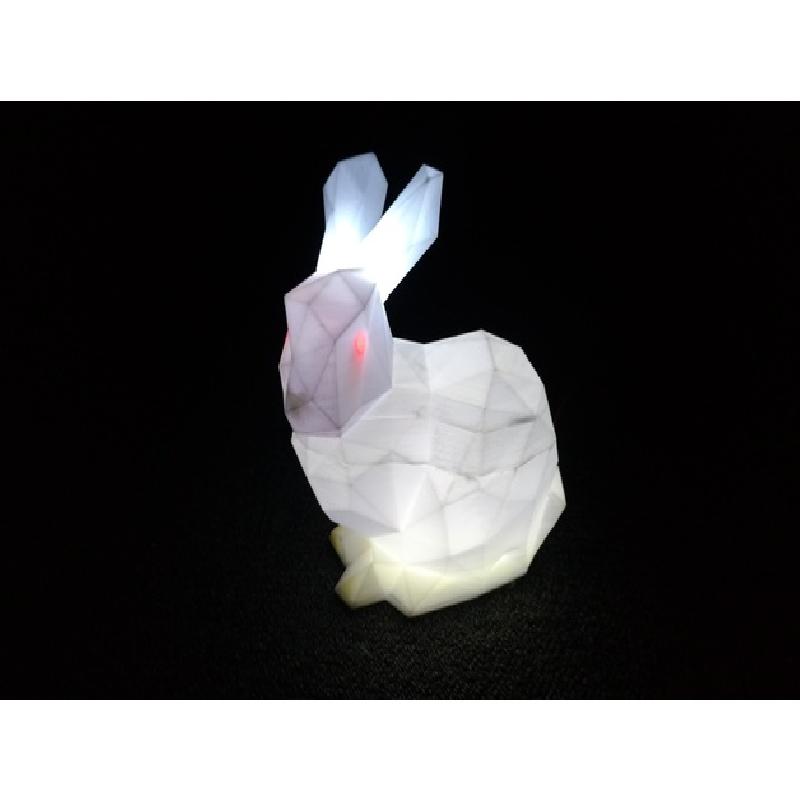 Low-Poly Bunny Lamp, modified to house 5mm dia LED's for separate illumination of the eyes and ears. Other LED's mounted in the base, along with an cable exit and strain relief.