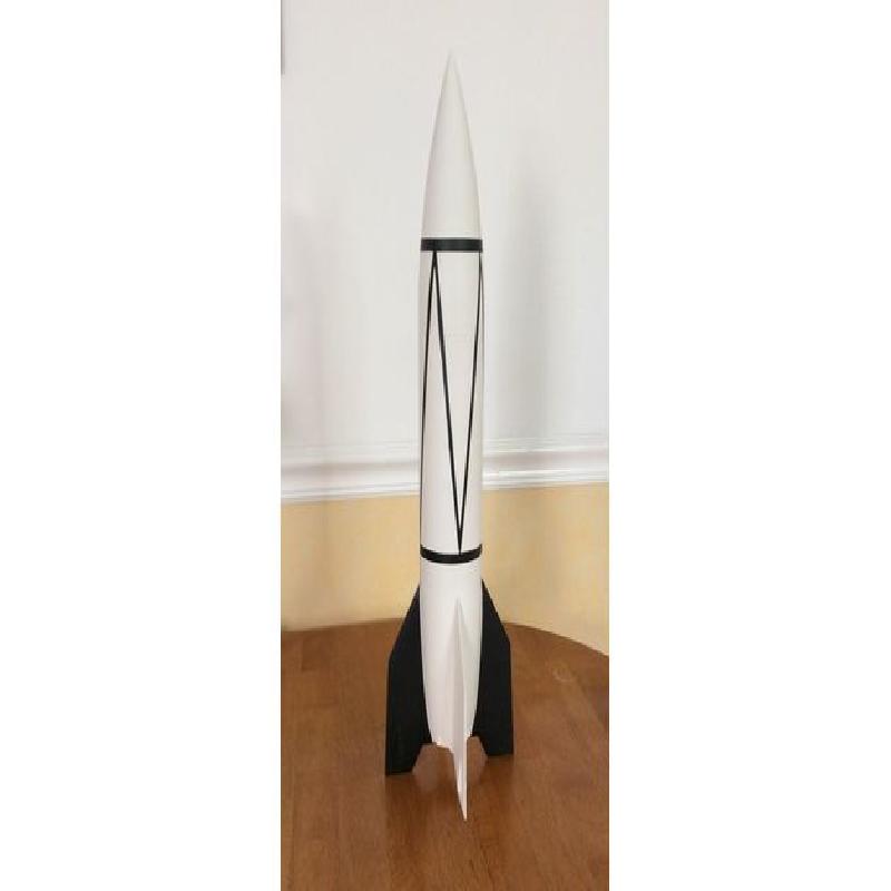 This model is mostly for display purposes, but I have added some features that should make it possible to use it as a flyable model rocket. The nose tip has a compartment for adding weight to position the center of gravity properly for stability. The fin section has supports so a motor tube with centering rings can be held in place when the mid-section is attached. The mid-section has an internal shock cord lug. I have posted two versions of the mid-section, one with 3/16" launch lugs and one version without.